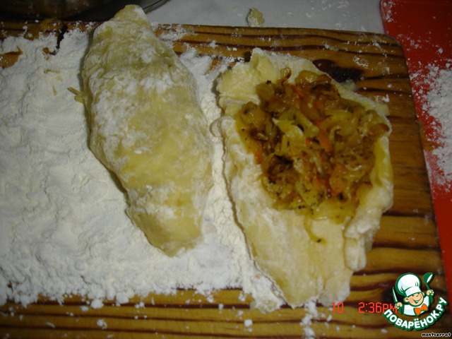 Куски массы обвалять в муке, расплескать, в центр лепешки положить ложку капустного фарша и слепить пирожок.