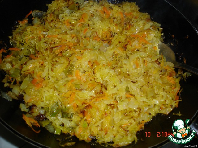 Готовим капустный фарш: лук обжариваем на масле до мягкости, добавляем квашеную капусту и жарим в течение часа на среднем огне. Надо следить, чтобы капуста не пригорела. Если капуста слишком кислая, добавить немного сахара. Я добавила дополнительно тертую морковь. Готовая капуста должна быть мягкая и достаточно сочная.
