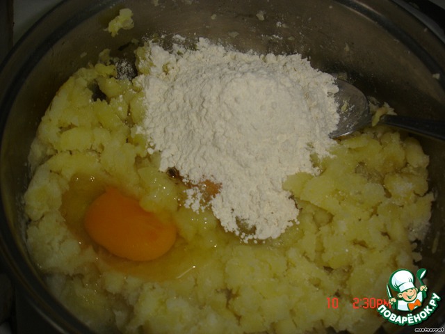 Пока капуста жарится, готовим картофельную массу: картофель отварить в кожуре, очистить, протереть горячим, слегка охладить, добавить яйца, муку, быстро замесить, разделить на куски. Разделывать массу надо сразу, иначе она разжижится и нельзя будет сформировать пирожки.