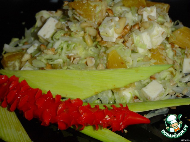 Добавляем брынзу, апельсины, перчим по вкусу и заправляем оливковым маслом.