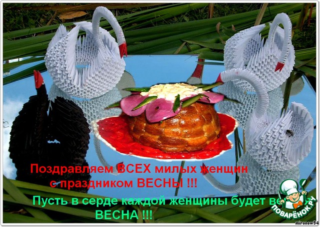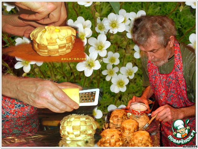 Как-то уже стало традицией, что непременным атрибутом нашего праздничного стола является пирог, но воодушевленные конкурсом решили сотворить что-то необыкновенное, КУЗОВОК С СЮРПРИЗОМ… Кулинарные эксперименты на праздничный стол всегда рискованны, но риск был оправдан! Блюдо получилось не только необычным, но и необычайно вкусным! Опару для теста приготовили обычным способом… В теплой молочной сыворотке растворили дрожжи и 3 столовых ложки сахара, добавили муки до сметанообразного состояния и дали забродить 2 часа, а дальше… На конкурс «ВЕСНА В СЕРДЦЕ»