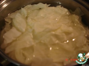 Аккуратно разобрать капусту на листья, хорошо отбить скалкой, стараясь не порвать листья.