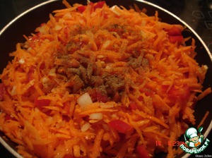 Отдельно жарим морковь с луком, перчиком, чеснок, специи, я добавила в морковь немного хмели-сунели (для тех кто любит рекомендую!),