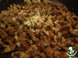 Жарим мелко порезанные грибы с луком (1 шт), чесноком, специи.