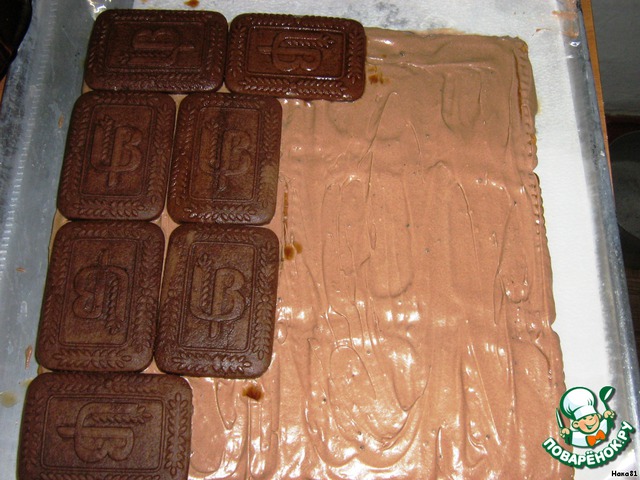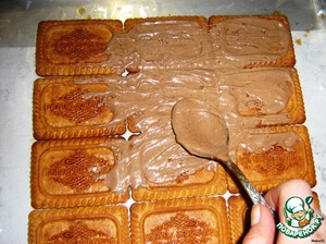 Затем промазываем толстым слоем крема и выкладываем следующий слой печенья.