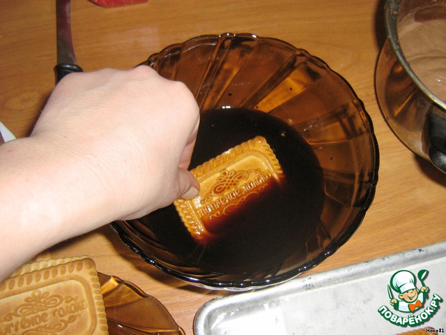 Далее опускаем в кофе каждую печенюшку и выкладываем их слоем на плоское блюдо.