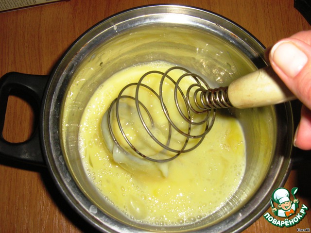 Затем готовим крем. В кастрюльку с толстым дном вбиваем яйца и хорошо взбиваем их венчиком.
