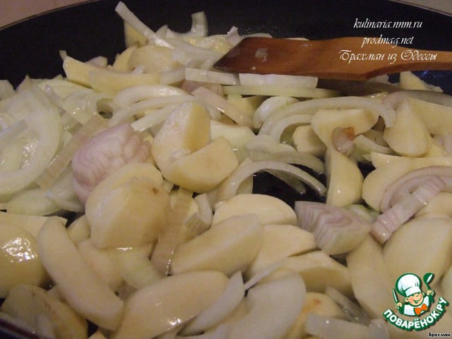 -обжарим лук с картошкой до красивого цвета и полуготовности. Нам не нужно, чтобы картофель разваливался. |