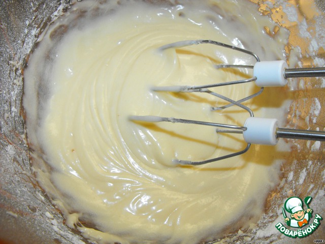 Масло, сахарную пудру, белки и муку взбить миксером на маленькой скорости, чтобы тесто стало однородным. |