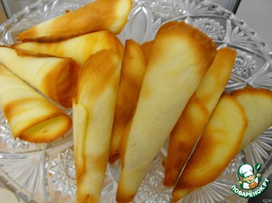 Выпекать при температуре 160-170 град., пока тесто не начнет подрумяниваться (примерно минут 10-12). Затем при помощи лопатки по одному вынимать из духовки и быстро скрутить в трубочки (кулечки).