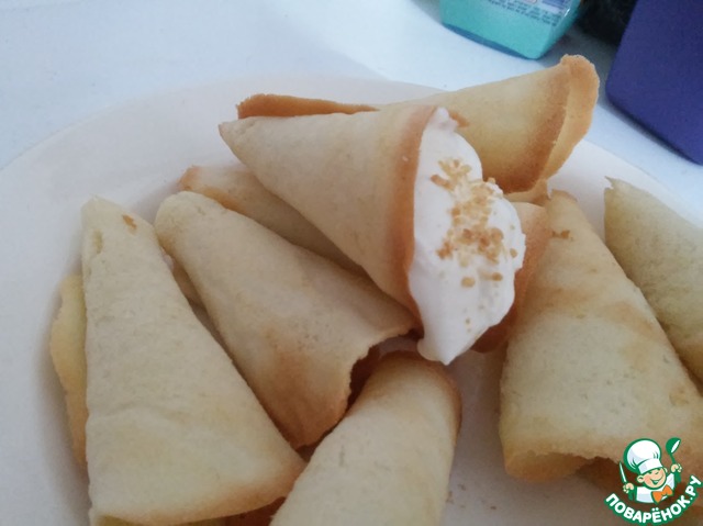 Выпекать при температуре 160-170 град., пока тесто не начнет подрумяниваться (примерно минут 10-12). Затем при помощи лопатки по одному вынимать из духовки и быстро скрутить в трубочки (кулечки). |