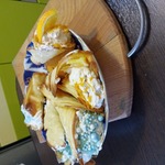 Начинила взбитыми сливками с корицей, украсила цедрой апельсина + долька апельсина