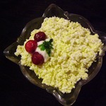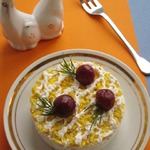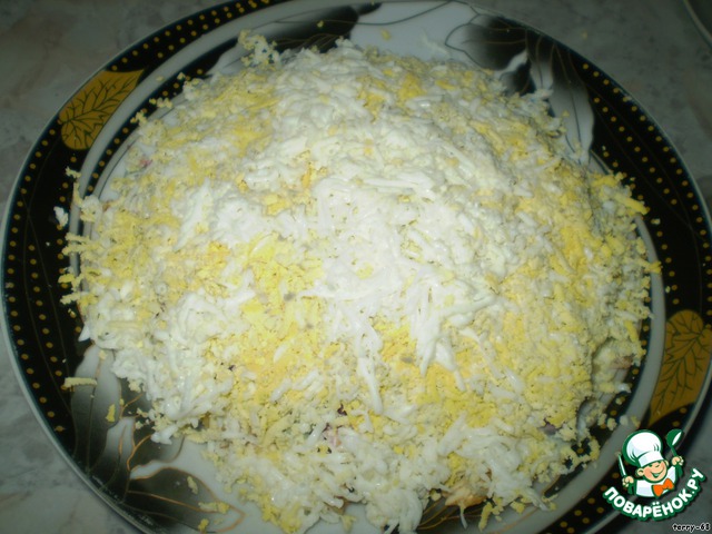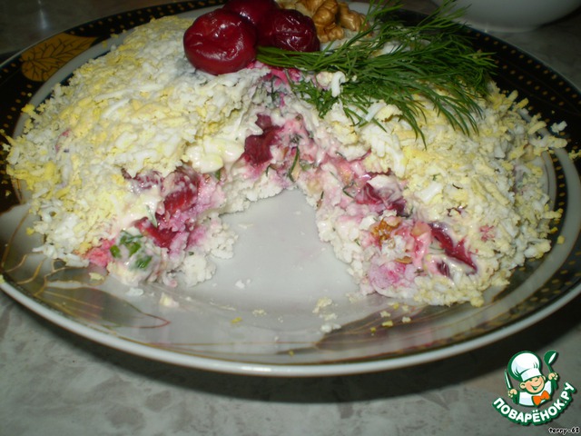 Покрываем вишню оставшимся майонезом с зеленью и натертыми на мелкой терке вареными яйцами.