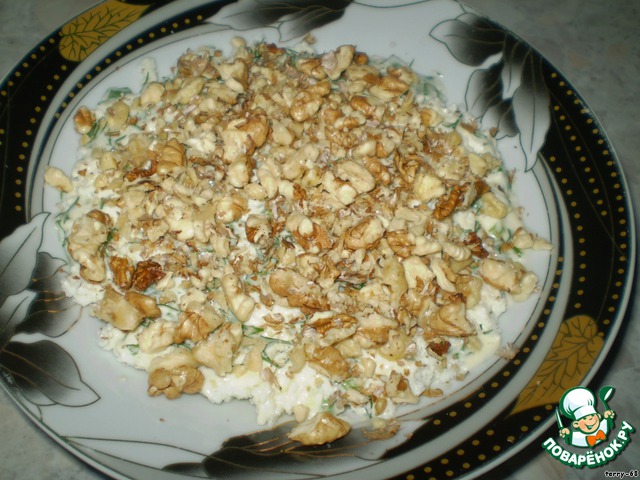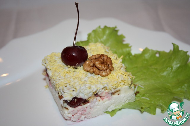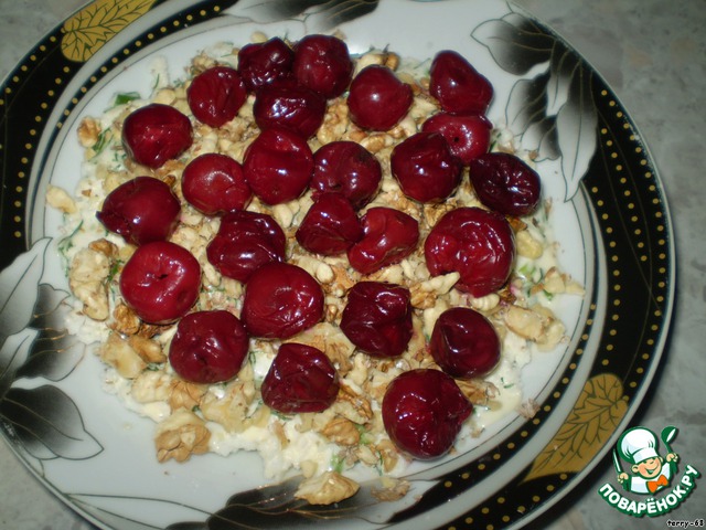 Салат из творога, вишни, орехов, очень нежный и вкусный. Вряд ли понравится мужчинам, так как без мяса.