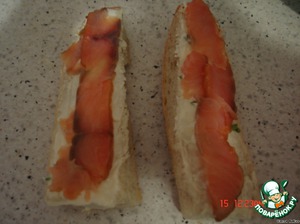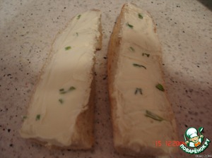 Багет порезать на небольшие кусочки и разрезать пополам, смазать сыром с добавленными специями и чесночком