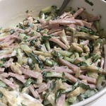 Огурец также нарезать соломкой, добавить к ветчине.