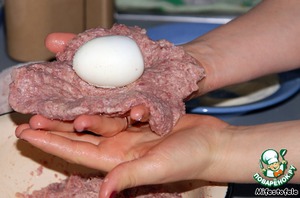 Берем комочек фарша, делаем из него большую тонкую лепешку, как для пирожка, но во всю ладонь. Кладем на середину варенное очищенное яйцо.