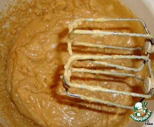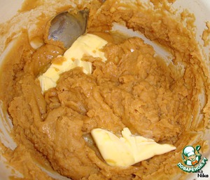 В толчёное печенье налить тёплое молоко (1,5 стак) и два желтка взбитые с сахаром (0,5 стак), поставить на слабый огонь, помешивая довести (почти) до кипения. Сняв с огня, добавить 250 гр сливочного масла и всю массу взбить миксером