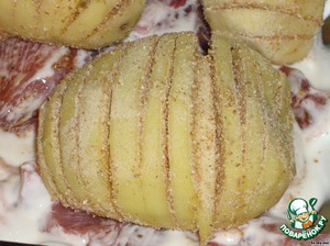 Теперь картошка! Почистить, и с помощью столовой ложки превратить ее в гармошку! А именно: ставим картошку в ложку и начинаем резать, именно ложка не позволит закончить надрез! Так что можете не волноваться!