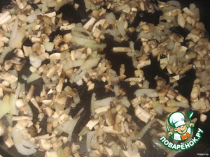 Шампиньоны и лук мелко нарезать, обжарить, остудить.