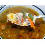 Суп процедить. Гущу и курицу измельчить в блендере, добавить сливки и все взбить. Полученное пюре вернуть в бульон, хорошенько перемешать.