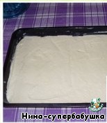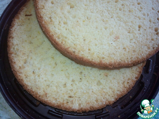 Противень или форму смазать сливочным маслом, выложить тесто, разровнять. Поставить в духовку, нагретую до 200 градусов, когда бисквит поднимется, температуру немного снизить (до 180 градусов). Выпекать около 20 минут. Вынуть пирог из духовки.