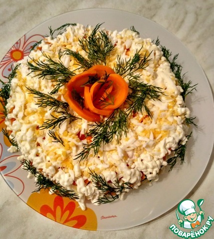 Засыпать салат натертыми на крупной терке белками. Украсить петрушкой и розой из тонких ломтиков соленой горбуши.