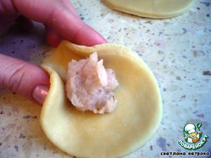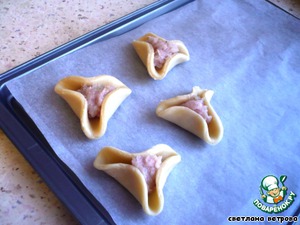 Выкладываем 1 чайную ложку фарша на тесто.