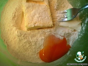 Муку просеять, кладём в муку масло, желток, сметану, соль (щепотку). И замешиваем тесто, я это делала руками. Чтобы тесто получилось однородным, добавим чуть-чуть водички. -
