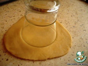 Теперь достаём наше тесто. Я отрезала небольшой кусочек и раскатывала. Стаканом выдавливаем кружочки.