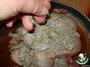 Хорошо натираем внутри и снаружи соевым соусом. Оставляем мариноваться (если на ночь - то в холодильнике).