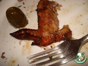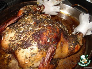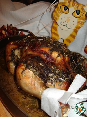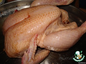Запекаем при 200° около 1,5 часов. Следите, чтоб курица прожарилась хорошо... Большое содержание жидкости в куре удлиняет процесс готовки.