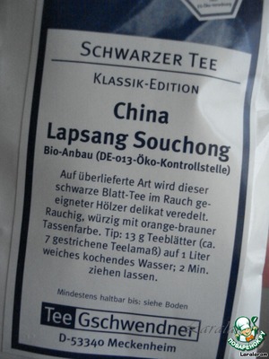 - Чай черный (копчёный, 4-5 мерных ложечек для чая (Lapsang Souchong); 1 мерная ложечка = около 2 г )