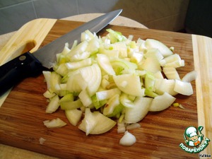Для начала подготовим продукты: порежем лук полукольцами или кубиком.