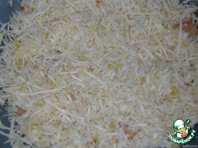 Приготовить кляр: свежий белый хлеб потереть на терке в мелкую крошку, добавить цедру одного лимона, тертый на мелкой терке сыр, соль и перец.