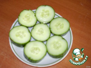 Возьмите свежий огурец, вымойте, нарежьте кольцами толщиной 5 – 7 мм и разложите на тарелке.