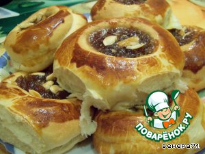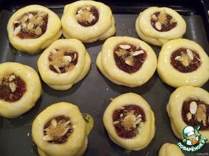Середину кольца заполнить джемом, вареньем и положить сверху миндальные пластинки. Смазать кольца желтком и посыпать сахаром.