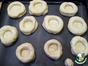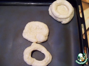 Вырезать из теста кружки и кольца (дырочку в кружочке сделать рюмкой). Разложить кружки на противень (застелить бумагой для выпечки).