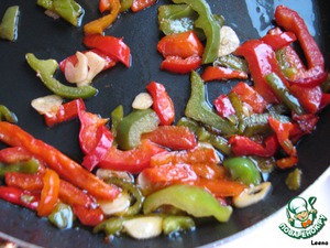 А затем слегка потомить болгарский перец и крупно порезанный чеснок для того, чтобы они не выделялись слишком резкими вкусами, а стали нежными и ароматными.