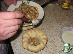 Выкладываем в наши формочки мясо с морковкой и луком.