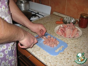 Затем срезанное мясо нарезает на маленькие кусочки.