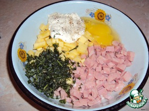 В отдельной посуде смешать порезанные сыр и ветчину, добавить яйцо, майонез, зелень (у меня была замороженная)слегка подсолить, поперчить, хорошо размешать.