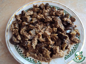 Баклажан порезать кубиками (у меня был замороженный и уже порезанный), слегка посолить, поперчить, сбрызнуть уксусом, обжарить на растительном масле, в конце жарки смешать с грецкими орехами, перекрученными через мясорубку и чесноком, ещё поджарить 2-3 минуты. Остудить.