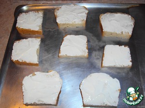 Белый хлеб порезать на ломтики, смазать сметаной.