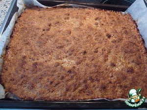 Дать немного остыть. Ещё тёплую выпечку порезать на квадраты, примерно 8х8 см. Разрезать квадраты по диагонали на треугольники.