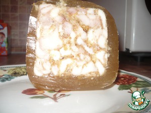 Наполняем кастрюлю водой, погружаем коробку и придавить чем-нибудь тяжелым, в моем случае стаканом. Варим 1 ч. на медленном огне. Остужаем и на 1,5-2ч. в морозилку.