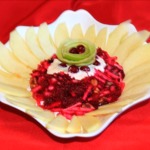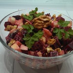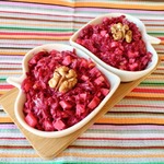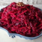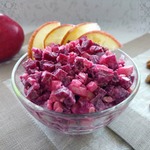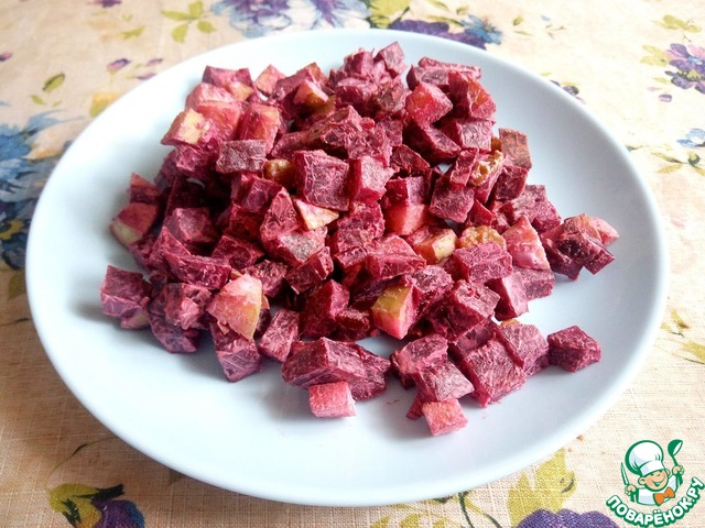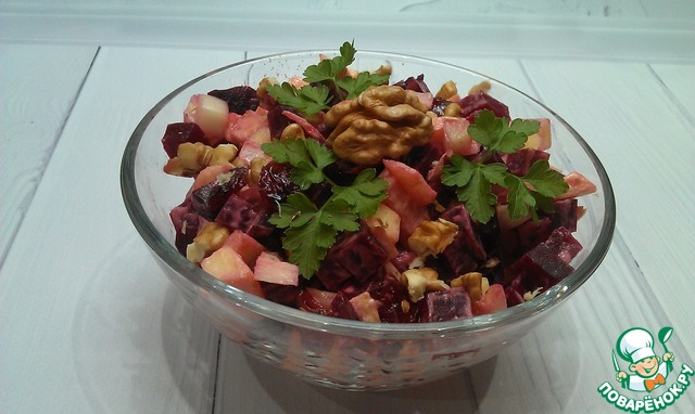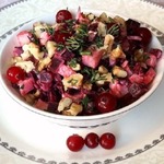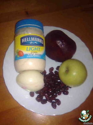 Лук измельчить. Клюкву пополам. Орехи порубить. -