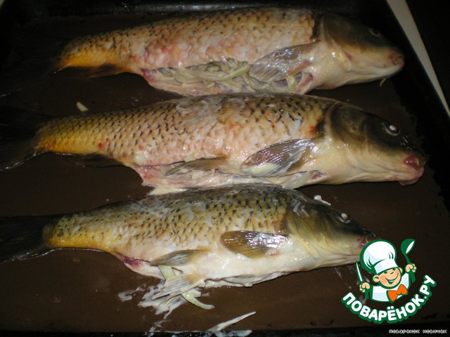 Запекать в духовке при температуре 180-200 градусов, приблизительно 30-40 мин, и все время, пока карп запекается, на противень подливать водичку, чтобы карпики не прижарились к противню.