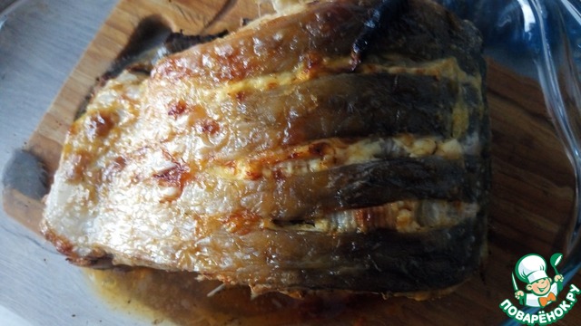 Сам по себе был жирный карп, плюс майонез. Лук вложила в брюшко и сделала надрезы и в них тоже лук.