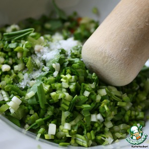 Черемшу режем мелко-мелко, да еще вдобавок разминаем с солью толкушкой, чтоб сок пустила.